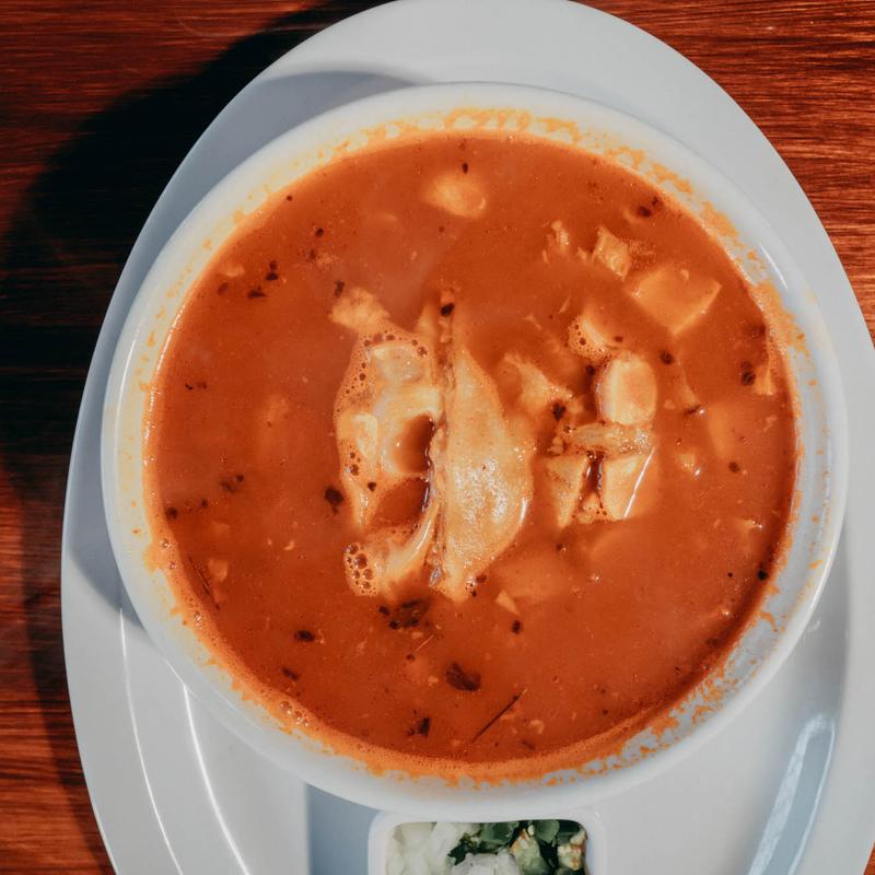 A classic Mexican soup made with tender beef tripe slowly simmered in a rich red chile broth. Served with hominy, fresh onions, cilantro, lime, and warm tortillas.