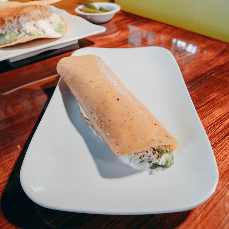 Our signature taco, filled with tender shredded chicken, guacamole, and Mexican crema, is served in a large corn tortilla.
